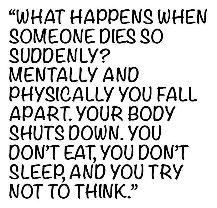 What happens when someone dies so suddenly? Mentally and physically you fall apart. Your body shuts down. You don’t eat, you don’t sleep, and you try not to think. Take a look at the person sitting next to you and imagine if tomorrow when you came to school they were not there. Imagine going to the cemetery and telling them all the things you forgot to tell them.